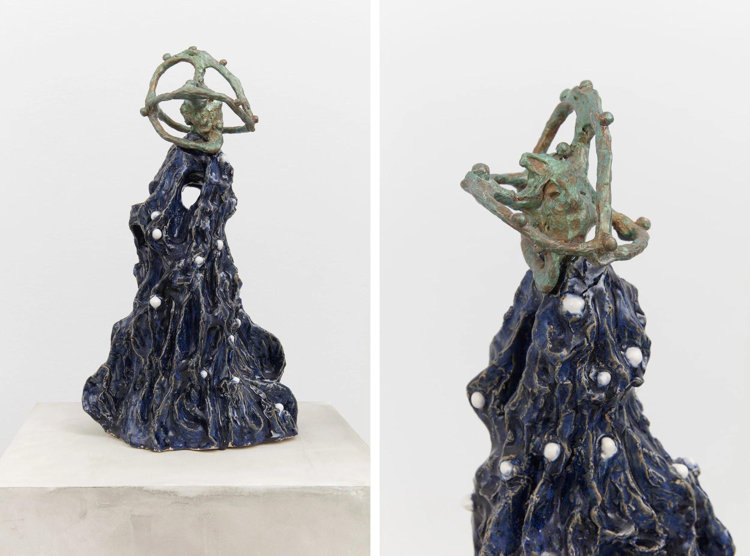 The second gallery presents a slippage into a realm no longer centered around corporeal experience. The gallery walls are flanked by monumental totems and a rippled archway composed of light blue and sea-green folds and adorned with cradled hands and jeweled orbs. Hovering in the middle of this ceramic enclosure/entrapment is a skeletal representation of Zhulong (燭龍), a primordial creature in Shanhaijing who manifests night and day by closing and opening its eyes, thus embodying time. Rock-like speakers dispersed around the central hanging sculpture like satellites emit subtle tones as sonic remnants of Zhulong. The environment is spatially intimate, yet psychically expansive, a permeable threshold between the monstrous and the sublime; prehistory and posterity; the animate and the inanimate.